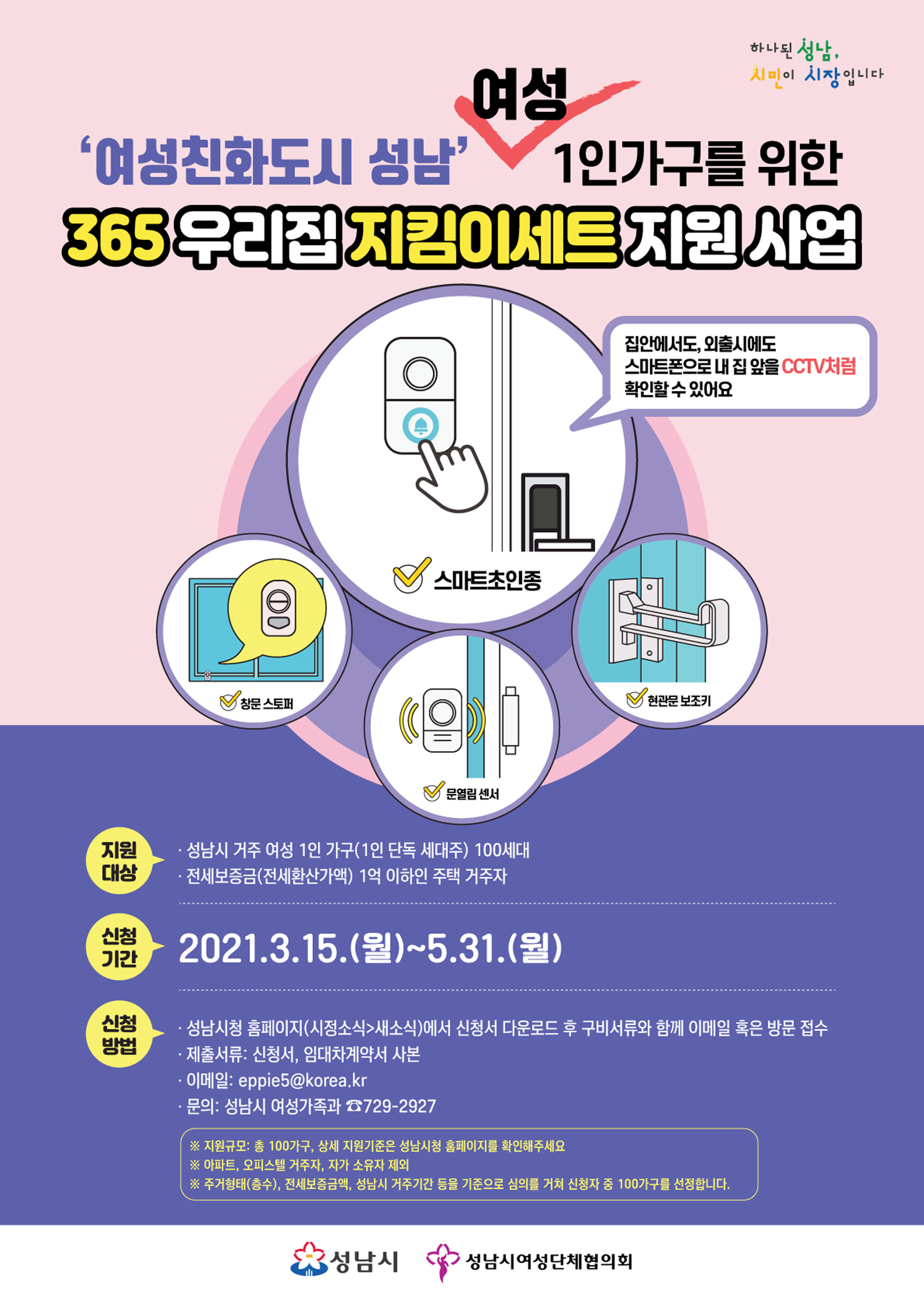 성남시는 여성 1인 가구의 안전한 주거생활을 위해 ‘365 우리집 지킴이 4종 세트 지원사업’을 편다.