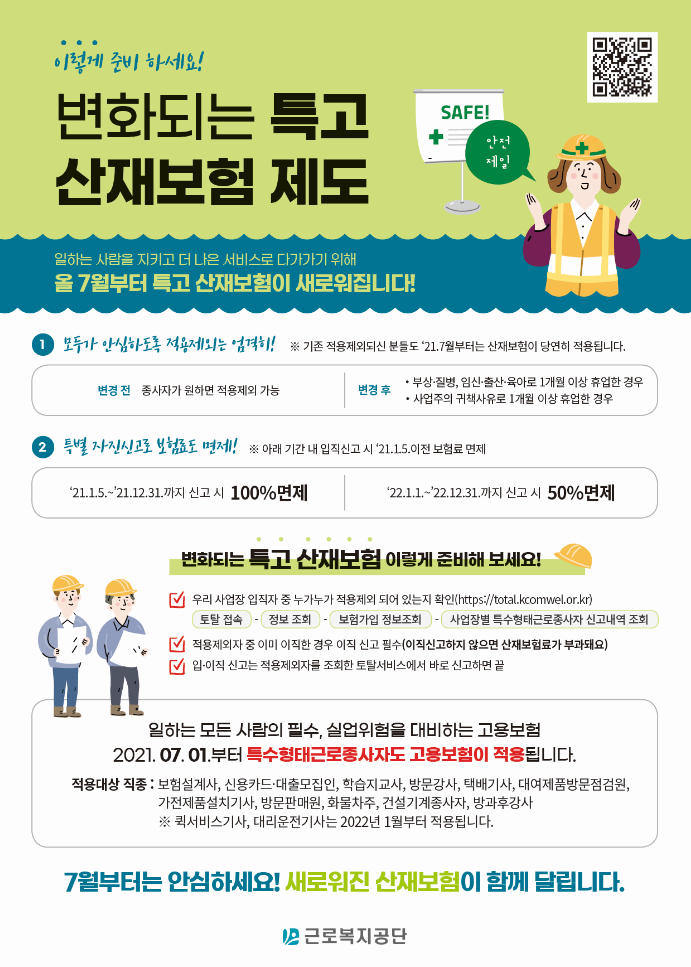 □ 근로복지공단(이사장 강순희)은 5월 10일부터 한 달 동안 고용․산재보험 가입 집중 홍보 기간을 운영하여 새로 적용되는 보험제도 및 가입 필요성을 국민이 쉽게 이해할 수 있도록 적극적으로 알릴 예정이다.
