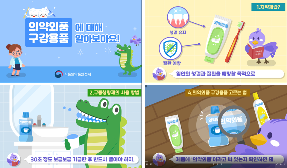 □ 식품의약품안전처(처장 김강립)는 제76회 6월 9일 ‘구강보건의 날’을 맞아 의약외품 치약제·구중청량제(이하 의약외품 구강용품)의 안전하고 올바른 사용방법을 안내하며, 특히 어린이용 동영상인 ‘의약외품 구강용품에 대해 알아보아요’를 제작해 식약처 누리집 등 온라인으로 배포한다고 밝혔습니다.