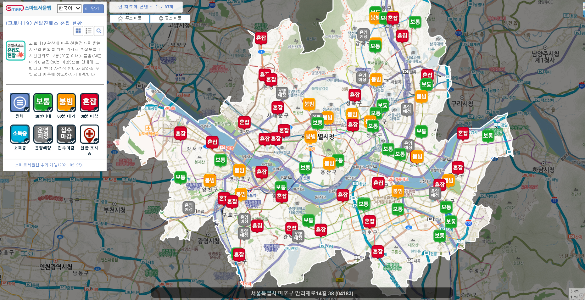 □ 서울시가 코로나19 검사를 받으려는 시민들이 무더위 속에서 장시간 기다려야 하는 불편을 해소하기 위해 7.12.부터 서울시내 선별진료소와 임시선별검사소의 실시간 혼잡도와 예상 대기시간을 온라인지도 ‘스마트서울맵(map.seoul.go.kr)’을 통해 안내한다.