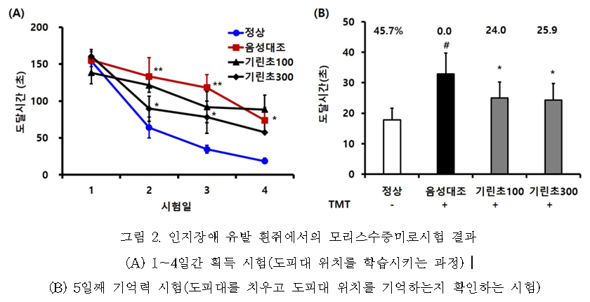○ 또한 인지기능장애를 유발한 동물(흰쥐)을 대상으로 기린초 잎 추출물을 각각 저농도(100mg/kg)와 고농도(300mg/kg)로 14일간 투여한 뒤 모리스수중미로시험을 실시한 결과, 기린초 잎 추출물 투여 집단은 기린초 잎을 처리하지 않고 인지기능장애만을 유발한 대조 집단보다 각각 24.0%, 25.9% 빨리 대피 장소(도피대가 있던 위치)에 도착했다.