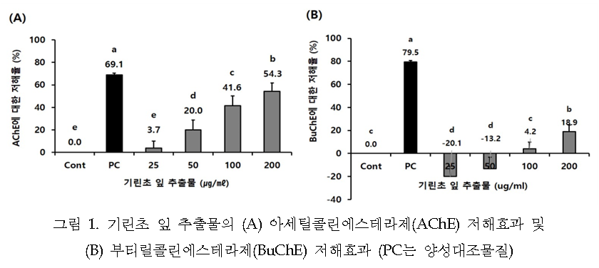 ▼그림 1. 기린초 잎 추출물의 (A) 아세틸콜린에스테라제(AChE) 저해효과 및 (B) 부티릴콜린에스테라제(BuChE) 저해효과 (PC는 양성대조물질)
